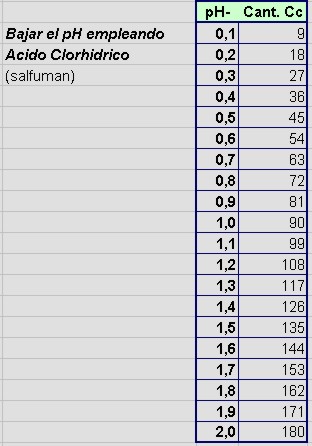 Para ajustar el pH, se deberá dosificar: -Acido clorhídrico (del 28% al 32%) para REDUCIR el pH, la dosis aproximada es la siguiente (para 10m3): |